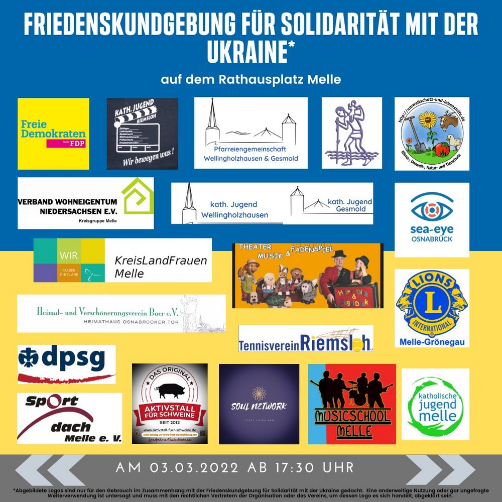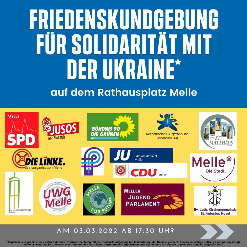 Am Donnerstag möchten wir mit euch wieder eine Friedenskundgebung auf dem Rathausplatz in Melle abhalten. Diese soll auf den kürzlich ausgebrochenen und ungerechten Krieg in der Ukraine hinweisen, der durch Russland geführt wird. Da dies ein Krieg ist, den die Mehrheit der russischen Bevölkerung nicht möchte und der durch einen einzelnen Machthaber herausgefordert wurde, möchten wir ein Zeichen für den Frieden setzen. Es ist unsere Aufgabe, uns dafür stark zu machen. Wir können nicht hinnehmen, dass dieser Konflikt auf den Schultern unschuldiger ukrainischer Bürger ausgetragen wird.