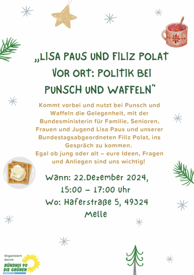 Kommt vorbei und nutzt bei Punsch und Waffeln die Gelegenheit, mit der Bundesministerin für Familie, Senioren, Frauen und Jugend Lisa Paus und unserer Bundestagsabgeordneten Filiz Polat, ins Gespräch zu kommen. Egal ob jung oder alt – eure Ideen, Fragen und Anliegen sind uns wichtig!