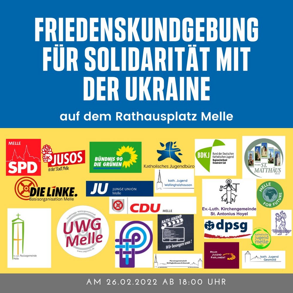 Als Zeichen der Solidarität versammeln wir uns am 26.02.2022 um 18:00 Uhr zu einer friedlichen Kundgebung in Melle.