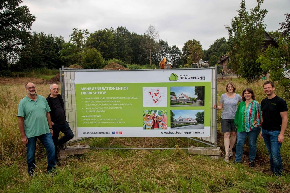 Daniel Aumüller, Geschäftsführer der Heggemann Hausbau GmbH erläuterte seinen grünen Mitstreiter*innen Silke Meier, George Trenkler, Regina Haase und Alfred Reehuis von Bündnis 90/Die Grünen das Mehrgenerationenprojekt Dierksheide in Melle-Neuenkirchen.